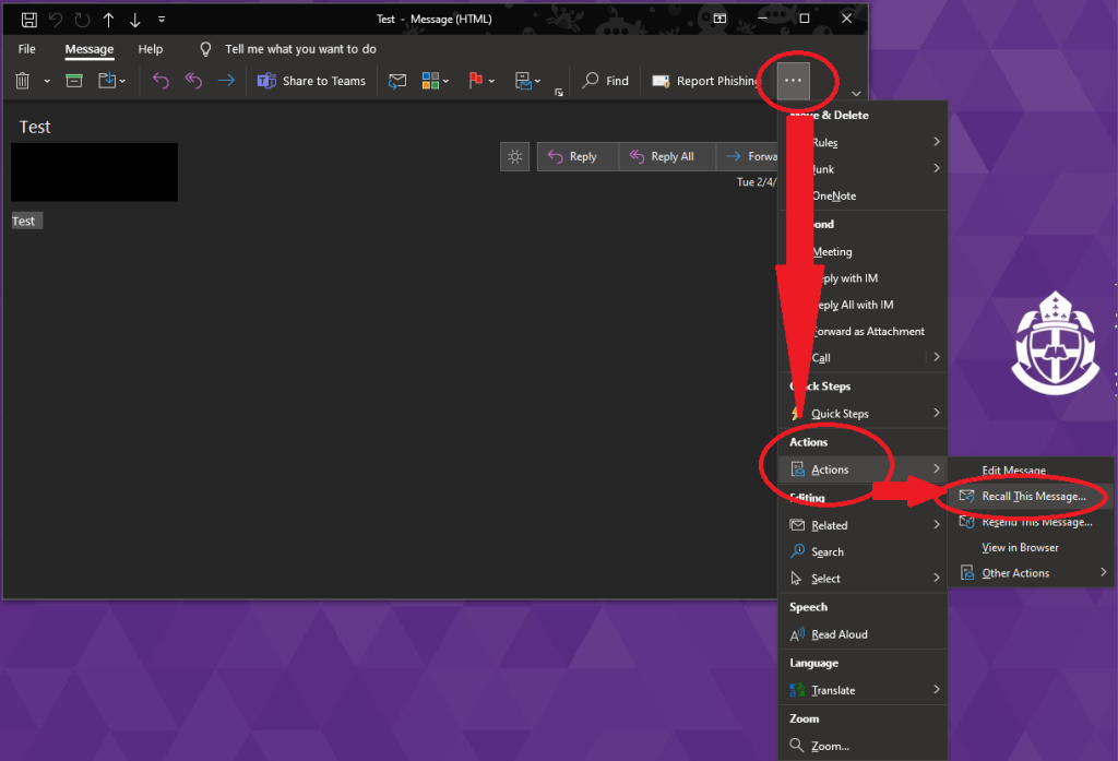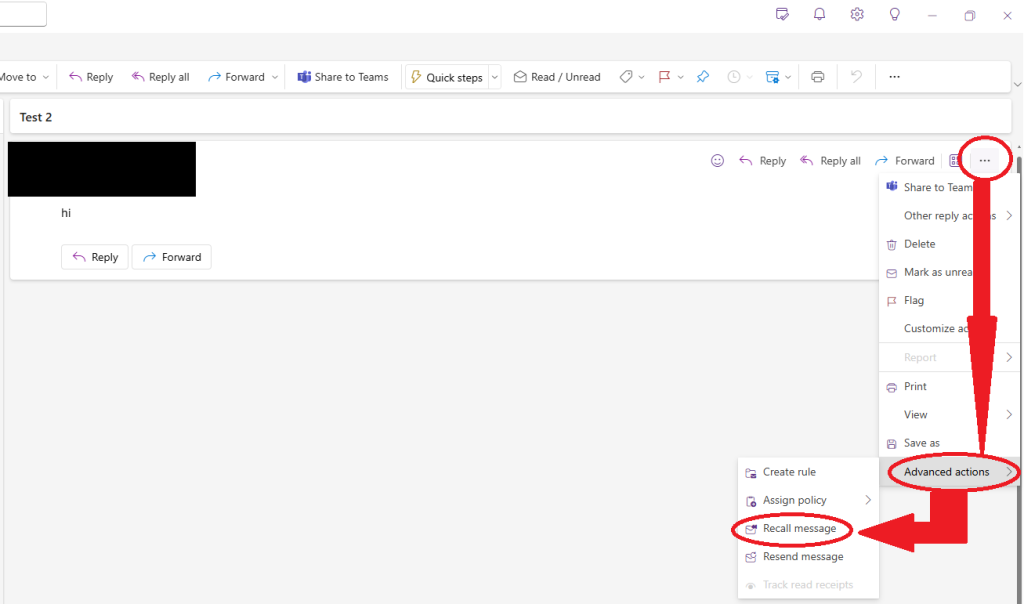 2. In the pop-up window, click on the 3 dots then click on “Action” and finally click on “Recall this message”.
